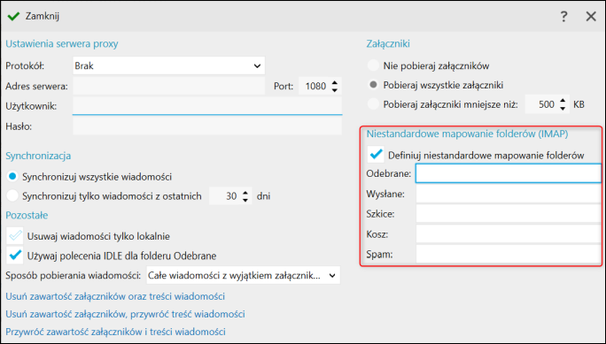 Niestandardowe mapowanie folderów IMAP powinno zostać wykonane przed pierwszą synchronizacją. Aby ustawić mapowanie, należy: