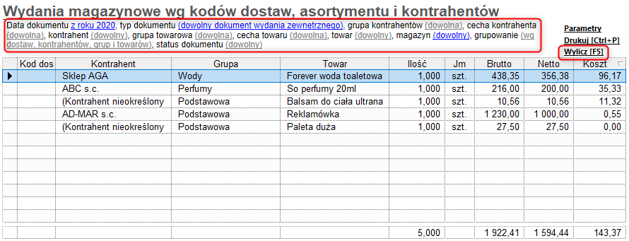 Subiekt GT – Jak wyliczyć zestawienie prezentujące wydania magazynowe według kodów dostaw, asortymentu i kontrahentów?