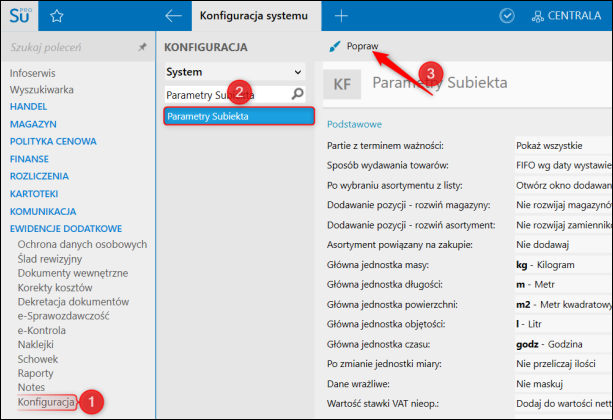 1. Przejść do modułu Konfiguracja – Parametry Subiekta, następnie kliknąć górne menu Popraw.