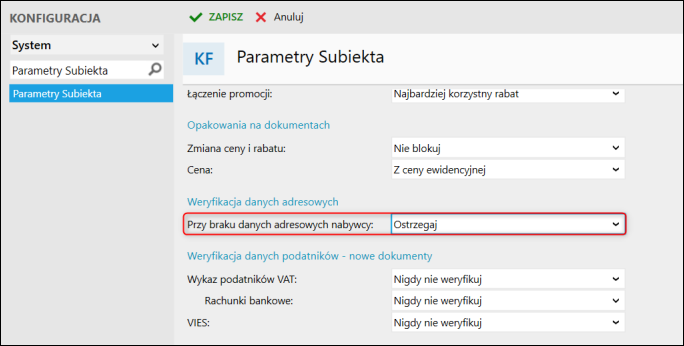 2. W sekcji Weryfikacja danych adresowych parametr Przy braku danych adresowych nabywcy ustawić na Ostrzegaj.
