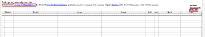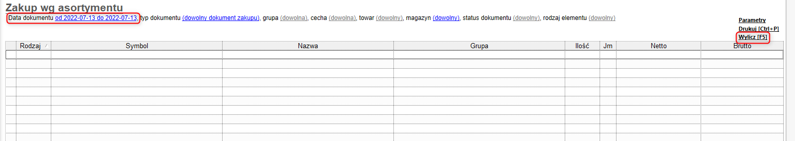 Aby wyliczyć zestawienie prezentujące zakup według asortymentu (ilość towaru, wartość netto i brutto zakupu we wskazanym okresie), należy: