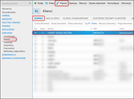 1. Przejść do modułu Kartoteki – Klienci i edytować wskazaną kartotekę.