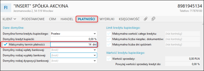 ​2. W oknie klienta, przejść na zakładkę Płatności, zaznaczyć opcję Maksymalny termin płatności i wprowadzić wartość liczbową w dniach.