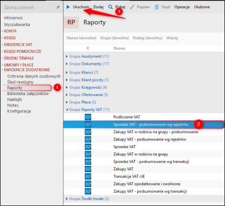1. Przejść do modułu Konfiguracja – Raporty i wybrać z listy Sprzedaż VAT - podsumowanie wg rejestrów.