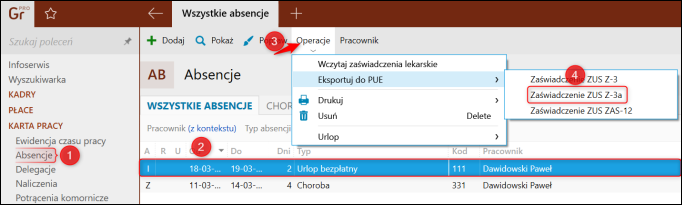 1. Przejść do modułu Karta Pracy – Absencje, zaznaczyć odpowiednią absencję i z górnego menu wybrać Operacje – Eksportuj do PUE – Zaświadczenie ZUS-Z3a.
