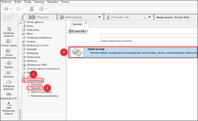 1. Z listy modułów wybrać Administracja – Słowniki, a z listy słowników Stawki prowizji.