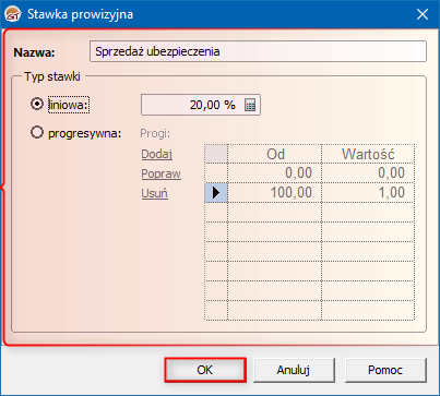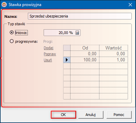 3. W następnym kroku należy zdefiniować nazwę nowej stawki prowizji oraz typ stawki. Przy typie stawki liniowa należy wprowadzić stały procent prowizji. Przy stawce progresywnej można zdefiniować progi, po przekroczeniu, których pracownikowi zmieniana jest stawka prowizyjna. Po dokonaniu niezbędnych ustawień stawkę akordową zapisać przyciskiem OK.