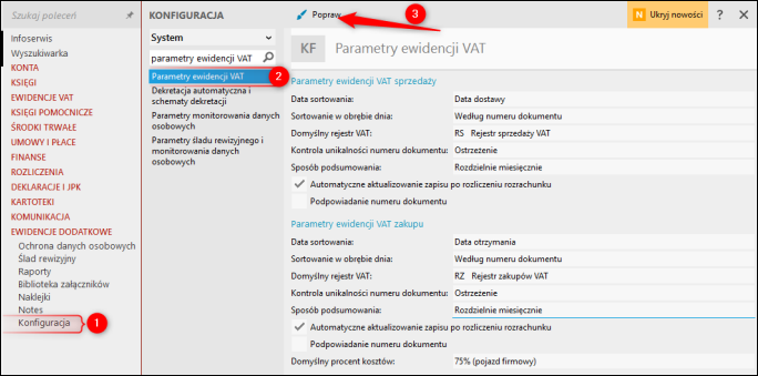 1. Przejść do modułu Konfiguracja – Parametry ewidencji VAT i wybrać Popraw.