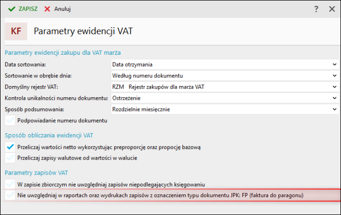 2. Zaznaczyć opcję Nie uwzględnia w raportach oraz wydrukach zapisów typu dokumentu JPK: FP (faktura do paragonu).
