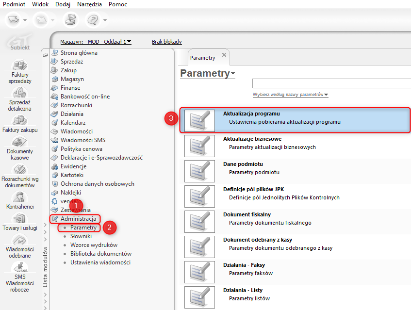 1. Z listy modułów wybrać AdministracjaParametry, a z listy parametrów Aktualizacja programu.
