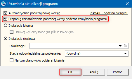 2. W oknie, które się wyświetli zaznaczyć Proponuj zainstalowanie pobranej wersji podczas zamykania programu.