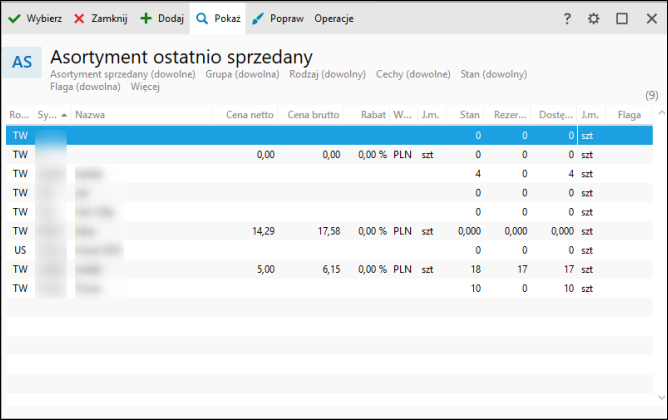 4. W oknie ostatnio sprzedanego asortymentu dostępne są filtry, mogące posłużyć uszczegółowieniu danych.