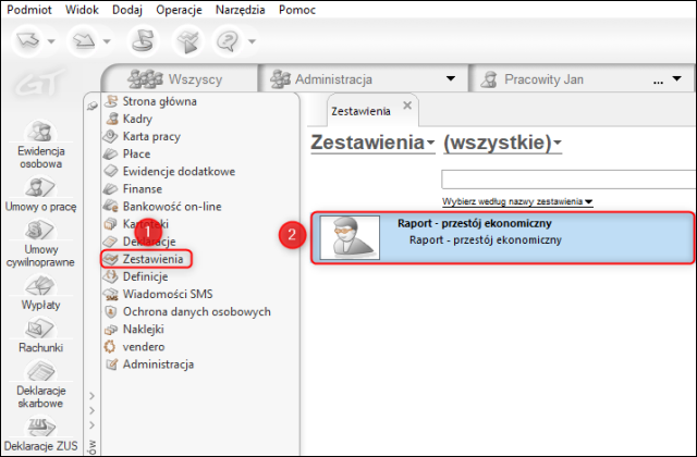 1. Z listy modułów wybrać Zestawienia, a z listy zestawień Raport – przestój ekonomiczny.