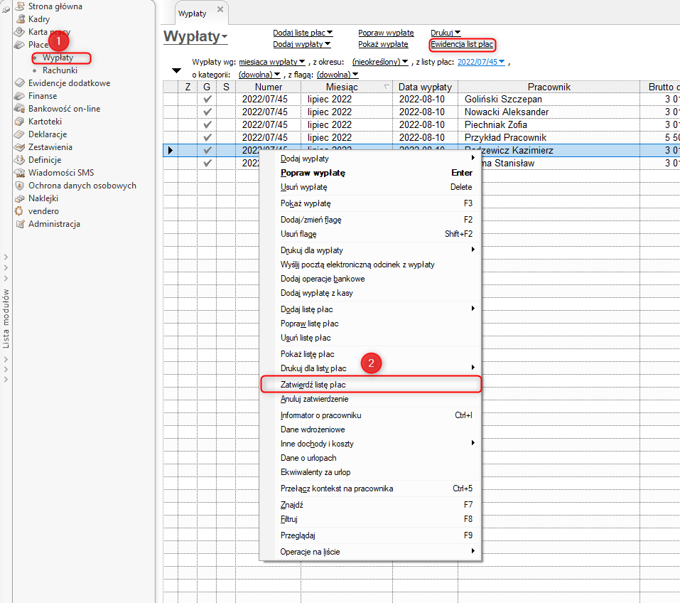 1. W module Płace  Wypłaty odnaleźć odpowiednią listę płac, a następnie ją Zatwierdzić (opcja dostępna pod PPM lub przyciskiem Ewidencja list płac). Tak samo postąpić z rachunkami do umów.