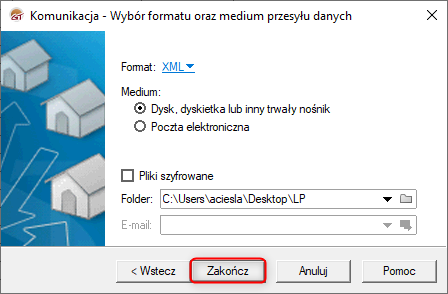 4. Wybrać folder, w którym zostanie utworzony plik xml i kliknąć Zakończ.