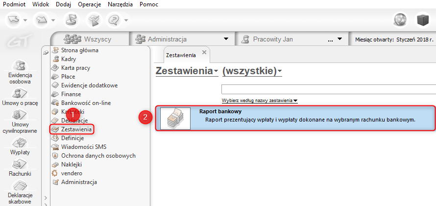 W celu wyliczenia w programie Gratyfikant GT zestawienia prezentującego wpłaty i wypłaty na wybranym rachunku bankowym należy:
