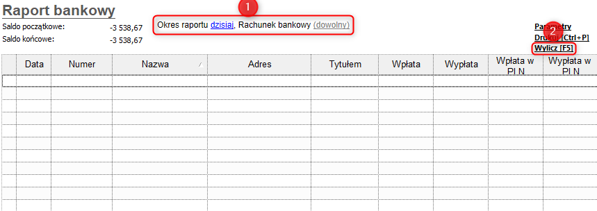 2. Wybrać zakres dat, z których mają zostać zaprezentowane dane oraz rachunek bankowy. Następnie kliknąć Wylicz.