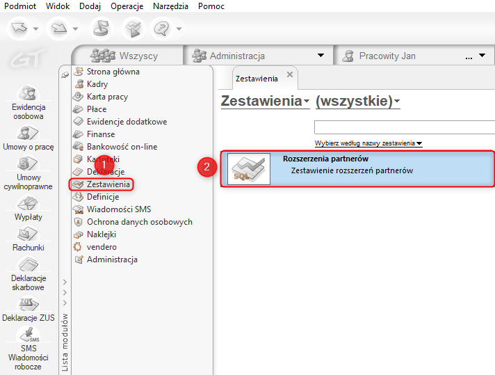 1. Z listy modułów wybrać Zestawienia, a z listy zestawień Rozszerzenia partnerów.