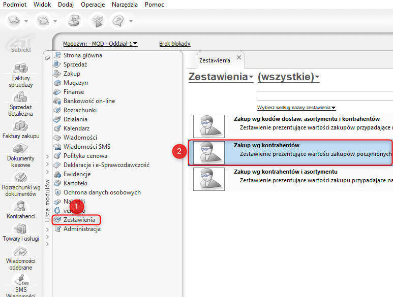 1. Z listy modułów wybrać Zestawienia, a z listy zestawień Zakup wg kontrahentów.