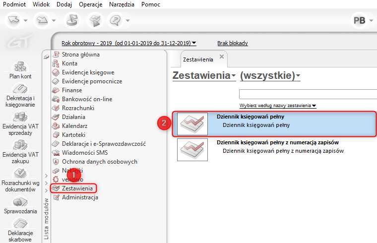 1. Z listy modułów wybrać Zestawienia, a z listy zestawień Dziennik księgowań pełny.