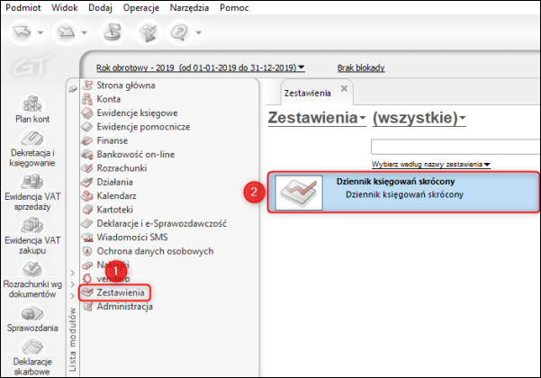 1. Z listy modułów wybrać Zestawienia, a z listy zestawień Dziennik księgowań skrócony.