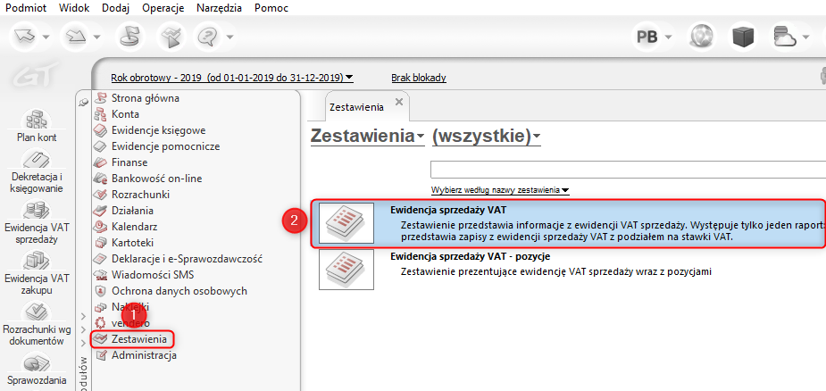 1. Z listy modułów wybrać Zestawienia, a z listy zestawień Ewidencja sprzedaży VAT.