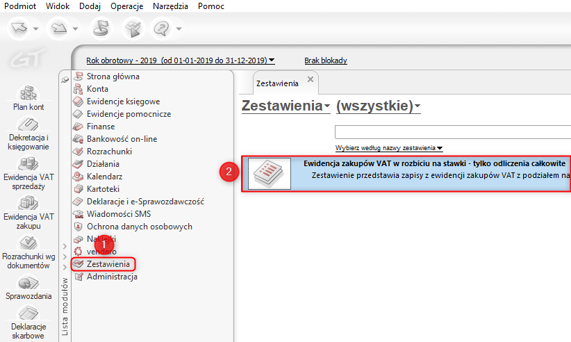 1. Z listy modułów wybrać Zestawienia, a z listy zestawień Ewidencja zakupów VAT w rozbiciu na stawki – tylko odliczenia całkowite.
