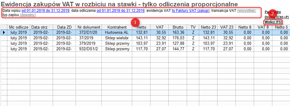 Rewizor GT – Jak wyliczyć zestawienie przedstawiające tylko zakupy zaopatrzeniowe i koszty z proporcjonalnym całkowitym w ewidencji zakupów VAT z podziałem na stawki?