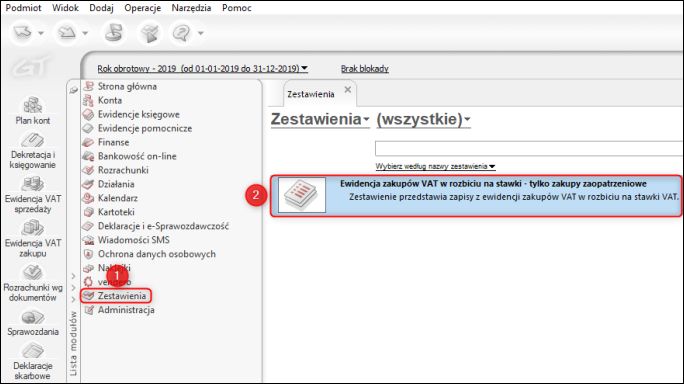 1. Z listy modułów wybrać Zestawienia, a z listy zestawień Ewidencja zakupów VAT w rozbiciu na stawki – tylko zakupy zaopatrzeniowe.