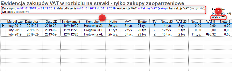 W celu wyliczenia w programie Rewizor GT zestawienia prezentującego tylko zakupy zaopatrzeniowe zapisane w ewidencji zakupów VAT w rozbiciu na stawki należy: