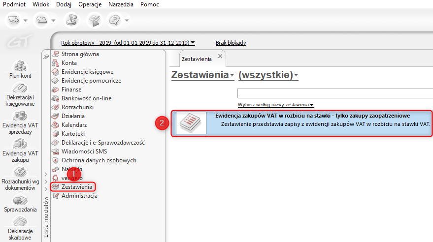 1. Z listy modułów wybrać Zestawienia, a z listy zestawień Ewidencja zakupów VAT w rozbiciu na stawki – tylko zakupy zaopatrzeniowe.