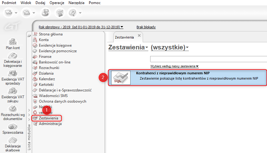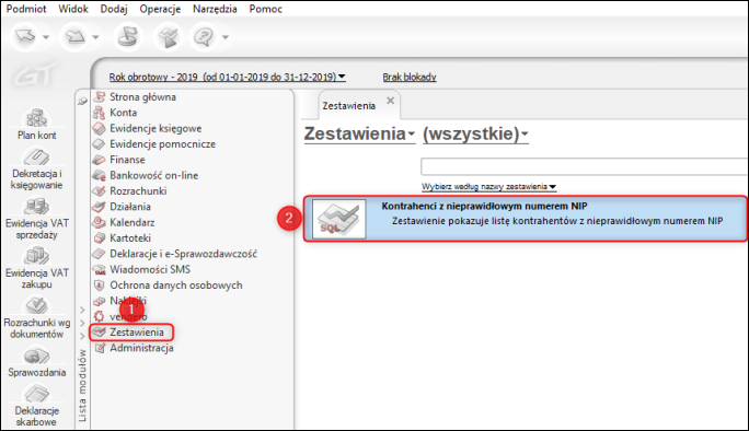 1. Z listy modułów wybrać Zestawienia, a z listy zestawień Kontrahenci z nieprawidłowym numerem NIP.