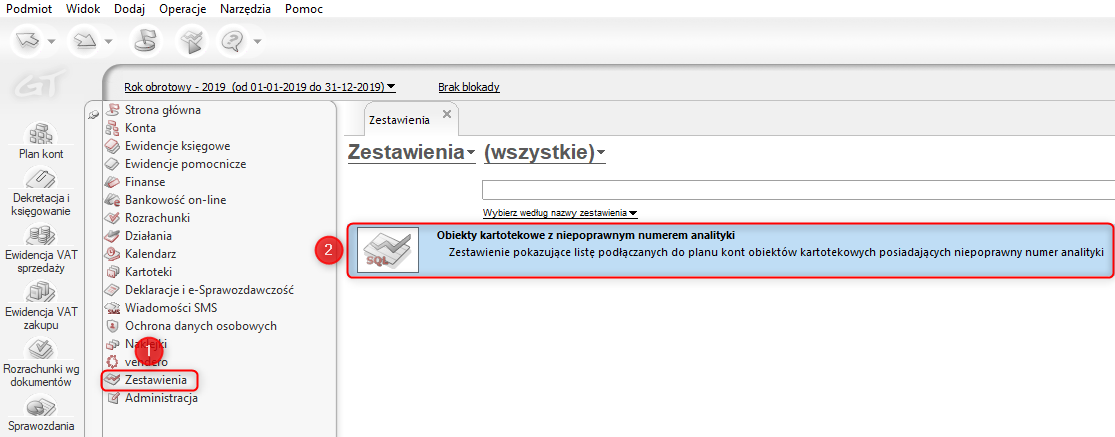 1. Z listy modułów wybrać Zestawienia, a z listy zestawień Obiekty kartotekowe z niepoprawnym numerem analityki.