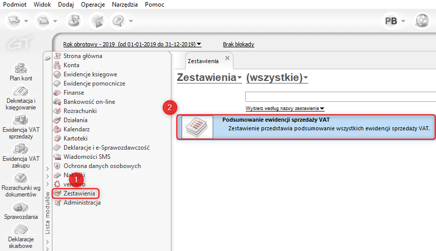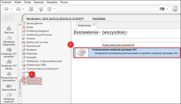 1. Z listy modułów wybrać Zestawienia, a z listy zestawień Podsumowanie ewidencji sprzedaży VAT.