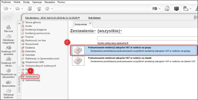 1. Z listy modułów wybrać Zestawienia, a z listy zestawień Podsumowanie ewidencji zakupów VAT w rozbiciu na grupy.