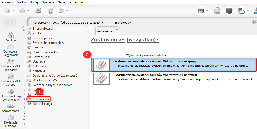 1. Z listy modułów wybrać Zestawienia, a z listy zestawień Podsumowanie ewidencji zakupów VAT w rozbiciu na grupy.