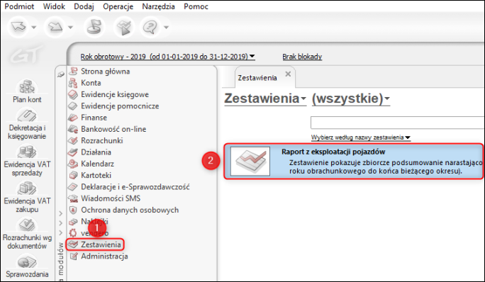 1. Z listy modułów wybrać Zestawienia, a z listy zestawień Raport z eksploatacji pojazdów.