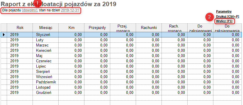 W celu wyliczenia w programie Rewizor GT zestawienia prezentującego zbiorcze podsumowanie narastająco okresami z ewidencji przejazdów i rachunków (zawsze od początku roku obrachunkowego do końca bieżącego okresu) należy: