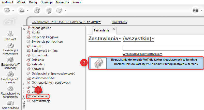 1. Z listy modułów wybrać Zestawienia, a z listy zestawień Rozrachunki do korekty VAT dla faktur nieopłaconych w terminie.