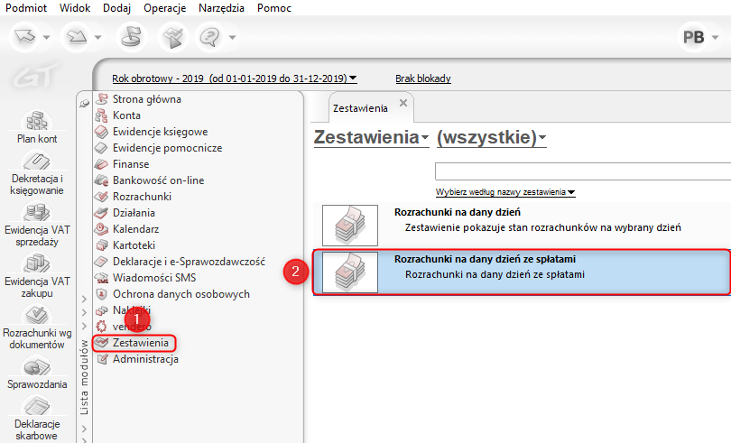 1. Z listy modułów wybrać Zestawienia, a z listy zestawień Rozrachunki na dany dzień ze spłatami.