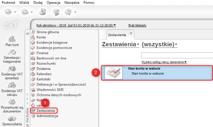 1. Z listy modułów wybrać Zestawienia, a z listy zestawień Stan konta w walucie.