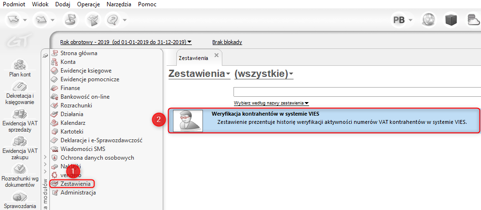 1. Z listy modułów wybrać Zestawienia, a z listy zestawień Weryfikacja kontrahentów w systemie VIES.