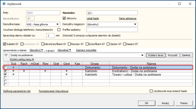 3. Na liście uprawnień odznaczyć pozycję o nazwie Dokumenty – Dodaj na podstawie. Aby zapisać zmiany, należy wybrać OK.