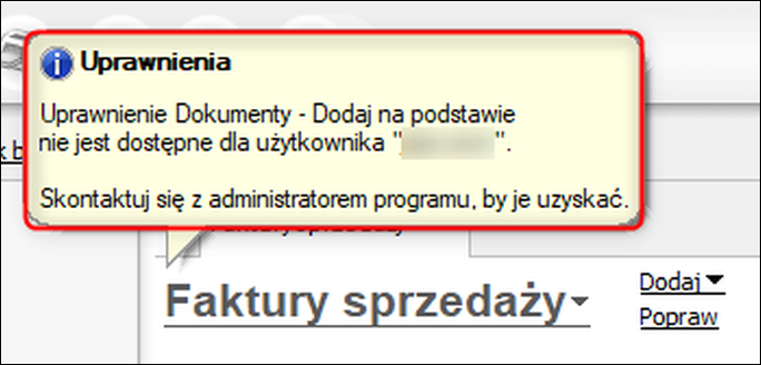 Rezultatem odebrania uprawnień będzie blokada możliwości dodawania dokumentów z pliku potwierdzona odpowiednim komunikatem.