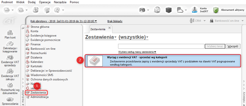 1. Z listy modułów wybrać Zestawienia, a z listy zestawień Wyciąg z ewidencji VAT – sprzedaż wg kategorii.