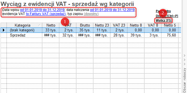 W celu wyliczenia w programie Rewizor GT zestawienia prezentującego zapisy z ewidencji VAT sprzedaży z podziałem na stawki VAT pogrupowane według kategorii należy: