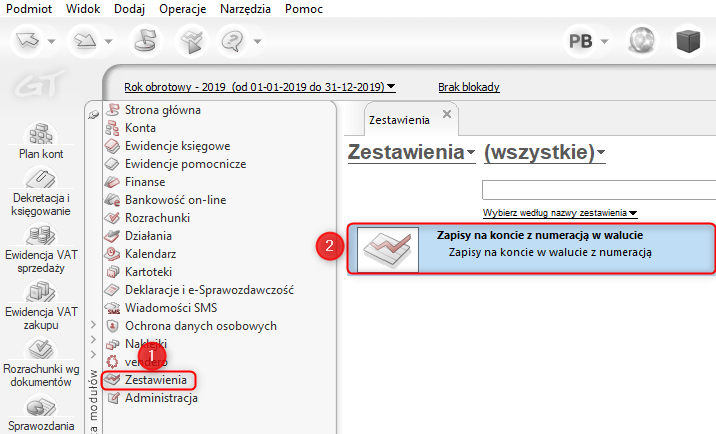 1. Z listy modułów wybrać Zestawienia, a z listy zestawień Zapisy na koncie z numeracją w walucie.