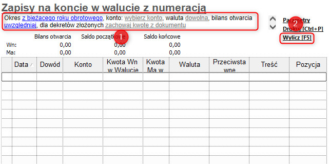W celu wyliczenia w programie Rewizor GT zestawienia prezentującego zapisy na koncie księgowym z numeracją w walucie należy: