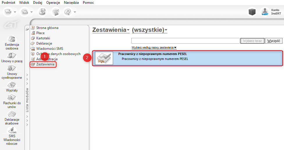 1. Z listy modułów wybrać Zestawienia, a z listy zestawień Pracownicy z niepoprawnym numerem PESEL.