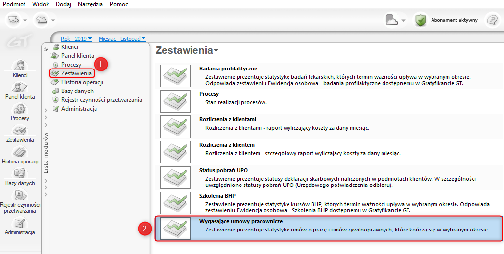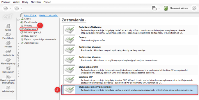 1. Z listy modułów wybrać Zestawienia, a z listy zestawień Wygasające umowy pracownicze.
